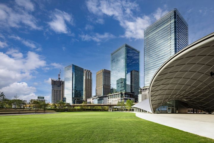 2024年9月に一部が先行開業した「グラングリーン大阪」は、多彩なショップやレストランをはじめ、ホテルやオフィス、レジデンスなどを有する巨大な複合施設で、この開発の大きな目玉。うめきた公園内でひときわ目を引くのが、SANAAが大屋根を手掛けた「ロートハートスクエアうめきた」。高さ13mの屋根付き、全天候対応型のイベントスペースで、広さは約1500㎡にも及ぶ。大屋根の緩やかな曲線は、隆起した芝生広場に溶け込んでいる。
