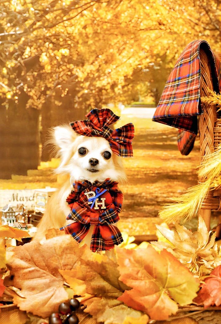 大きな耳と目が愛らしいメロンちゃんは、先住犬のパピヨンにそっくりで、飼い主さんは出会った瞬間運命を感じたそう! この日は、タータンチェック柄の大きなリボンとマフラーでおめかし♪ イチョウ並木が黄金色に輝く背景にぴったりな秋コーデは、「パピリーヒルズ」で揃えました。