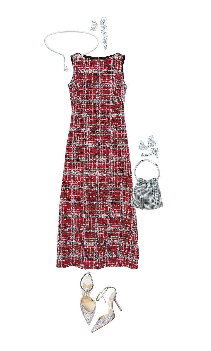 赤の花柄レースの上にチェック刺繍を施したドレスは、クラシカルな愛らしさとドレッシーな品格がクロスオーバー。シンプルなフォルムが、手の込んだ柄の美しさを引き立てます。アシンメトリーなピアスやチョーカーネックレスなど、遊びの効いたジュエリーでスタイリッシュに。きらめくバッグやパンプスが華やかさを加えます。