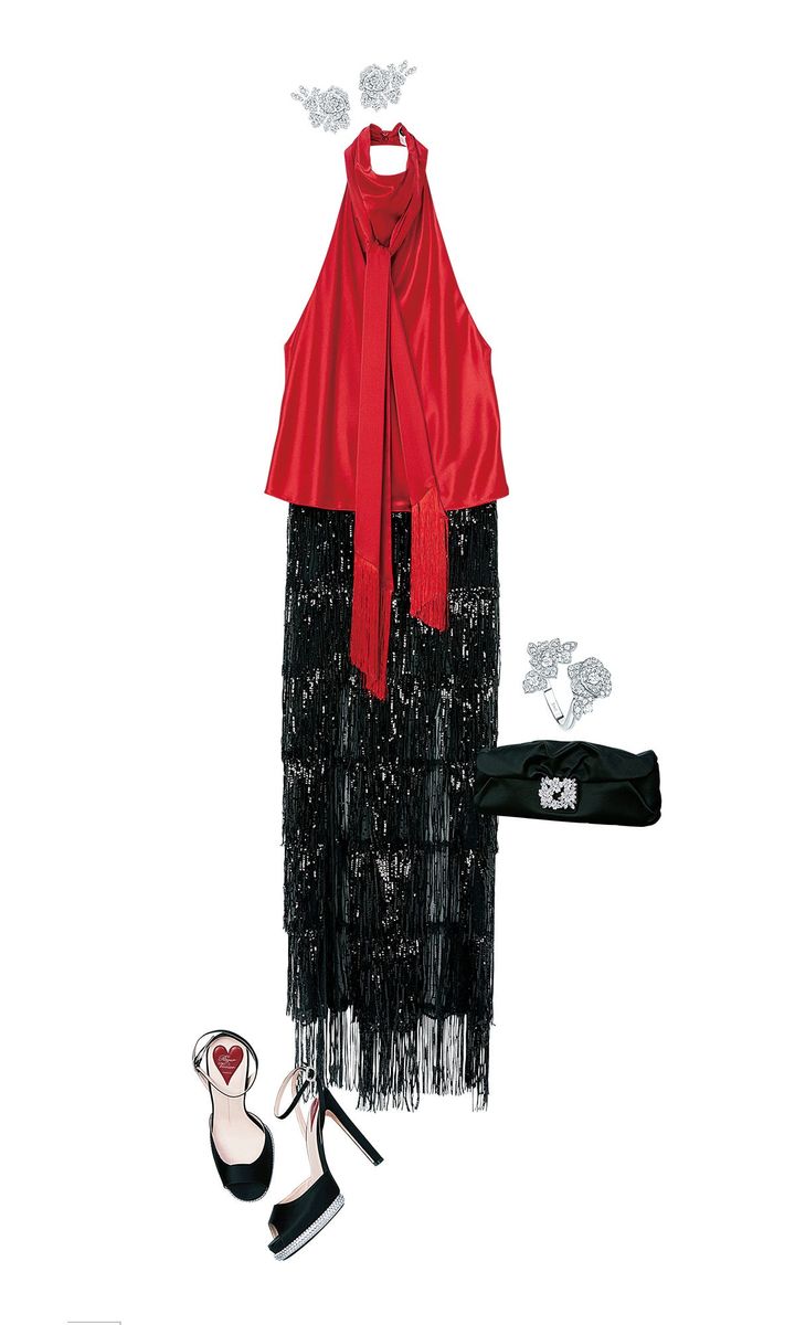 ホルターネックのトップスは、上品な光沢と滑らかさが優美。バックは大胆に開いたエッジィなデザインで、周囲の視線が集中します。スパンコール付きのフリンジスカートと小物は黒でまとめて、モードな雰囲気をオン。バラが咲き誇るピアスとリングがプレシャスな輝きを添えます。
