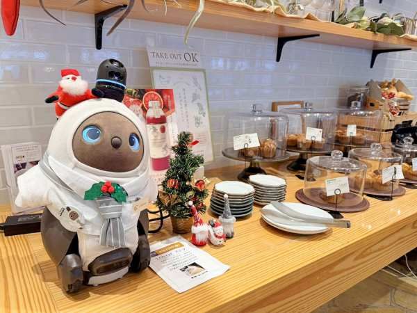 入口では、つぶらな瞳のLOVOT「しなちゃん」がお出迎え。コラボメニューもありましたよ。癒されながら体にやさしい料理を楽しめるお店でした。