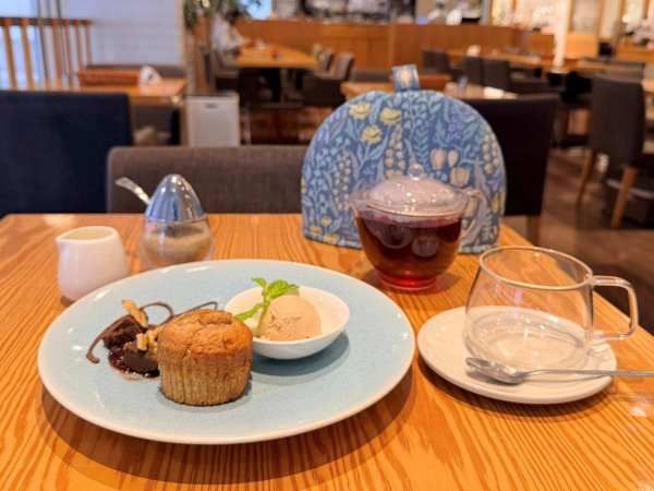 スイーツメニューも見逃せません。 今回いただいたのは、期間限定メニューの「シナグロセレクトスイーツプレート」(1,320円)。ミラノの老舗の職人が手がけるジェラート、動物性食材不使用のプラントベースマフィン、濃厚なテリーヌ・ド・ショコラがセットになっています。あれもこれも食べたい私にぴったりの一皿でした。