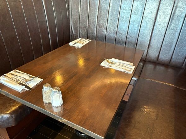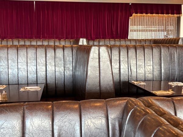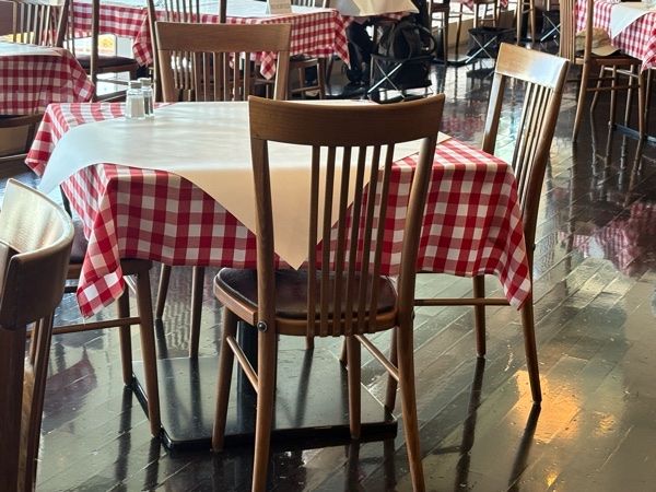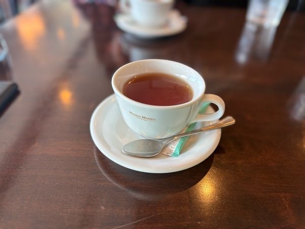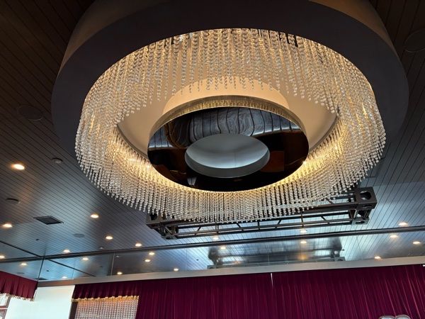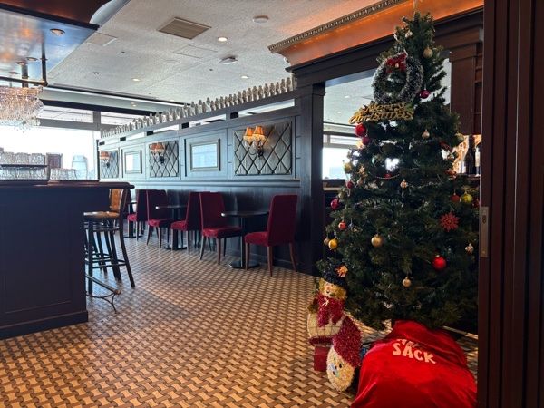 大きなツリーの写真を1枚カシャ。歴史感のあるシャンデリア。ソファ席は一段の段差を上る。ソファ席は広めのテーブルになってるよ。
