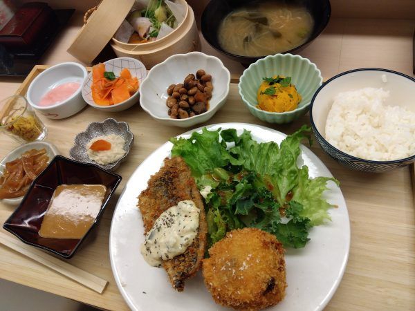 メインの高知県産あじフライとうなぎ蒲焼入りコロッケは、揚げたてサクサクで丁寧な仕込みが分かるオイシサに感動!この日のお総菜は、かぼちゃのクランベリー入りサラダ、五目豆、酢の物、にんじんラぺ、柿の白あえなど、7種類ですよ~。そして、限定数ゲリラサービスの野菜のせいろ蒸しも!今後も寒い日には、ゲリラサービスがあるそうですよ。楽しみですね。そして、ご飯、大きな椀に入ったお味噌汁。写真以上に、ボリューム満点でしたよ。オイシイ~。