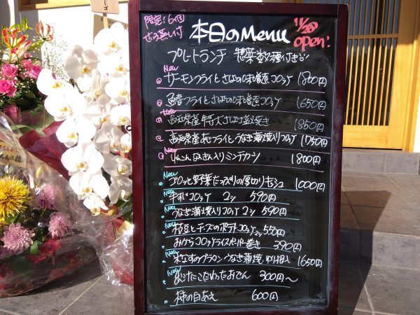 この日は、5種類のメイン(ピンクの丸印)からプレートランチが選べましたよ。どれも魅力的で迷いますよね。この日のオーナーのオススメは、もちろん全部!! 新メニューのれんこんなんきん入りのミンチカツは、大きく作りすぎたので凄いボリュームとのことでしたよ。一品料理(ブルーの丸印・テイクウトOK)も、おいしそうですよね。