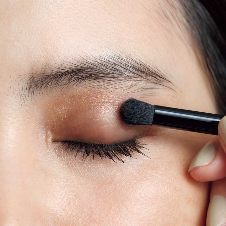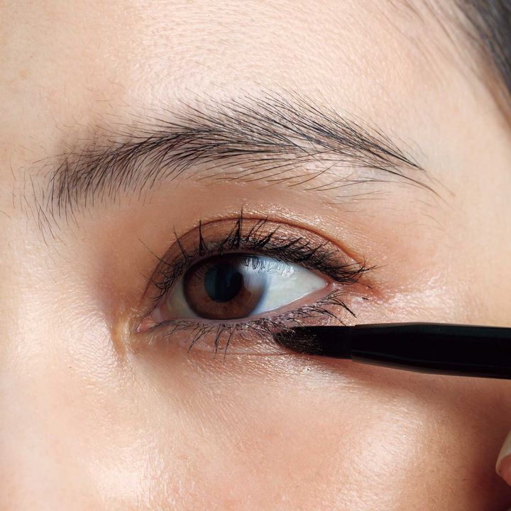 グラデーションをつけすぎないのが今っぽい印象に仕上げるコツ。まつ毛のキワは右下のブラウンを細いチップでライン状に描いて。下まぶたは細いブラシを使って、左下を目頭から目尻に馴染ませます。