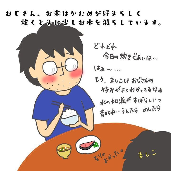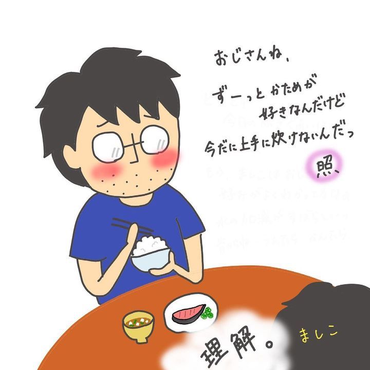 照れちゃうおじさんさんがちょっぴりかわいらしいですね!と同時に、パートナー好みのご飯を炊くましこさんも素敵!ちなみに、ましこさん自身も硬めが好きなようで、好みがマッチしているようで良かったです!
