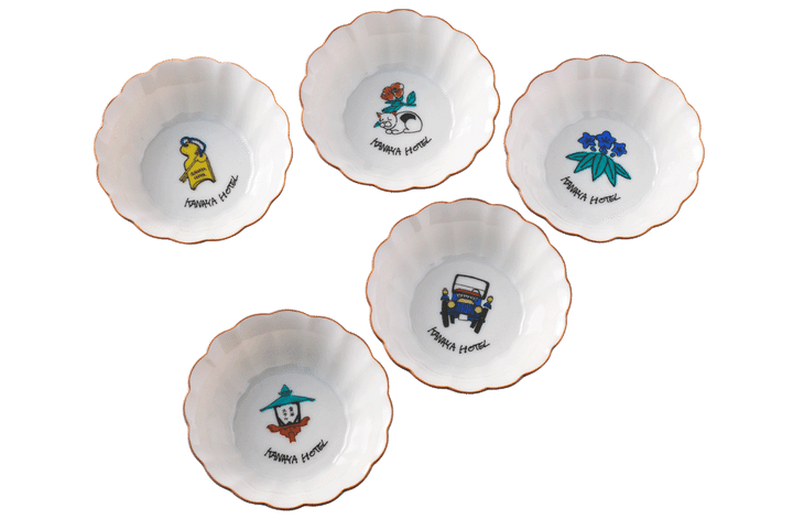 明治6年にスタートした「日光金谷ホテル」は、“現存する日本最古のリゾートホテル”と言われている。オリジナルグッズも充実していて、その中の一つが九谷焼の菊小鉢。昔ながらの鍵の形をした「ルームキー」や、象徴的な「外灯」、施設内にある彫刻「眠り猫」、ホテルのロゴマークにもなっている「笹竜胆」、かつて送迎に使われていた「フォード車」といった、ホテルと縁のあるモチーフがイラストであしらわれた全5種類を展開する。