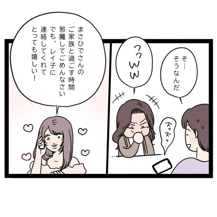 「そ・・そうなんだ」と答えるまさひでの前で、思わず吹き出しそうになる私。すると、「まさひでさんのご家族と過ごす時間、邪魔してごめんなさい。でもレイ子に連絡してくれてとっても嬉しい!」と甘~い声で話すレイ子に、