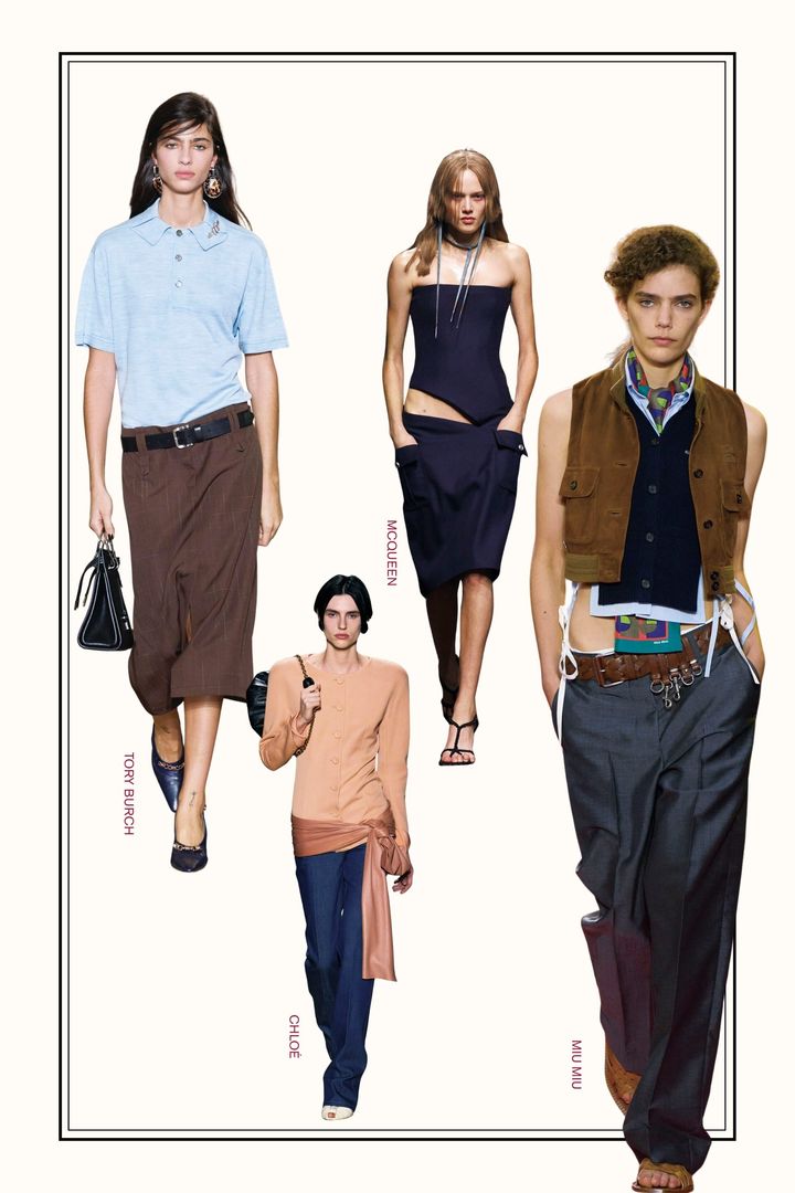まだまだ下がるウエスト位置。今季は服の上からベルトマークした、肌を出さないローライズのスタイリングも多彩に登場。露出に抵抗がある人もこれなら挑戦できそう!?