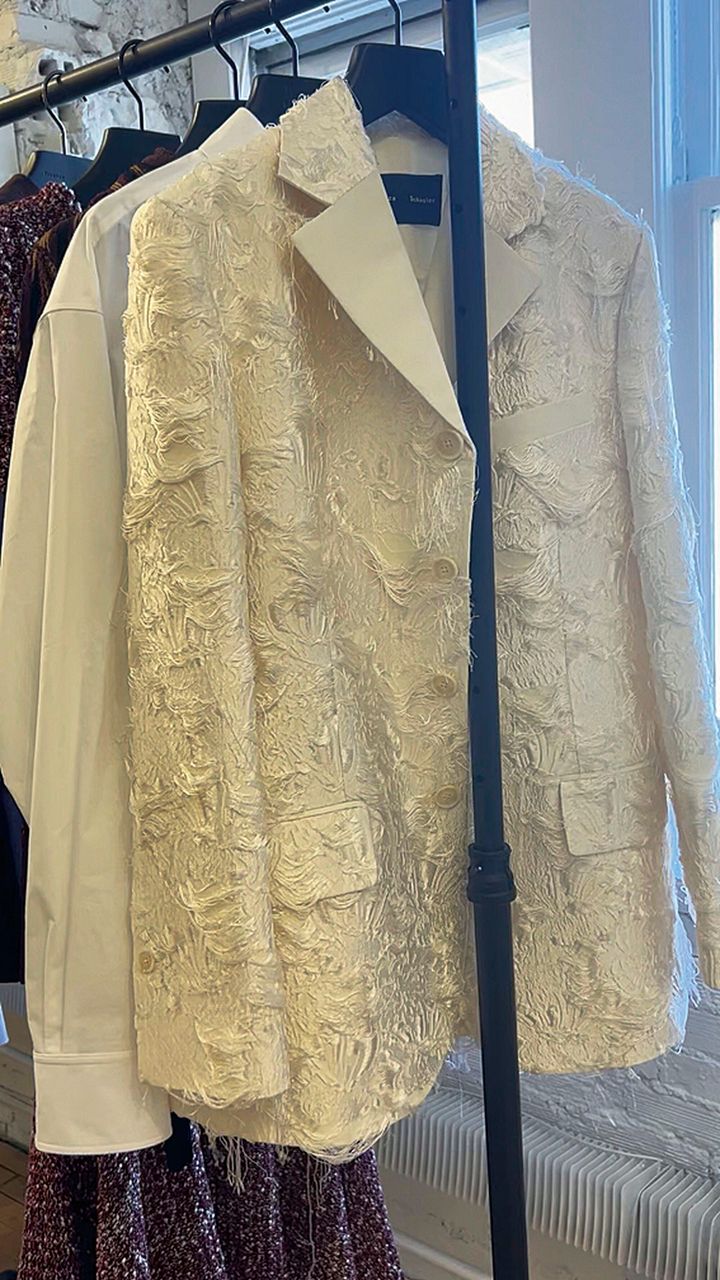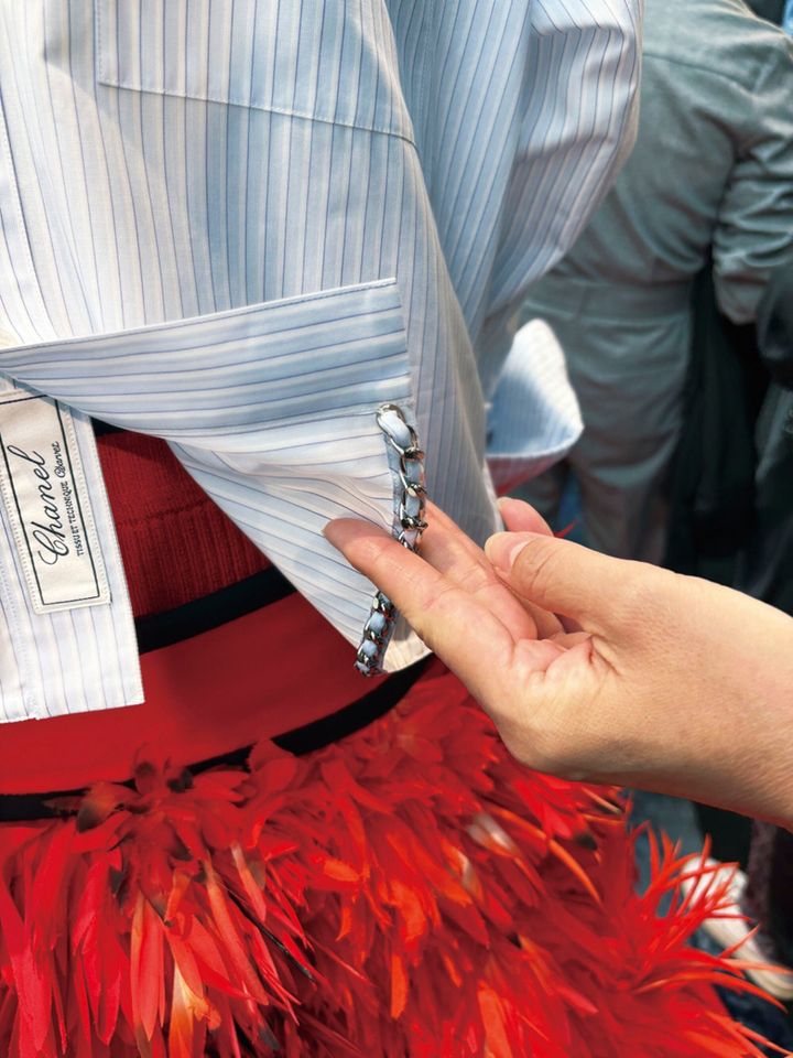 「ショー翌日、鼻息荒く訪れた『シャネル』の展示会。会場で熱視線を浴びていた『シャルベ』とのシャツは、裏側にチェーンが施されているという夢のディテール」