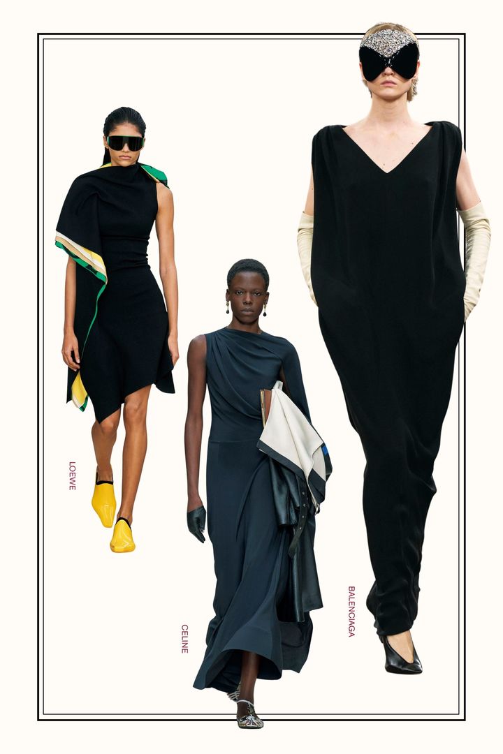 モダンに進化した令和のリトル・ブラックドレス。フィット&フレアのクラシカルなシルエットは封印され、ミニマルさはありつつもドレープやシームレスを利かせた流動的なシルエットへ。