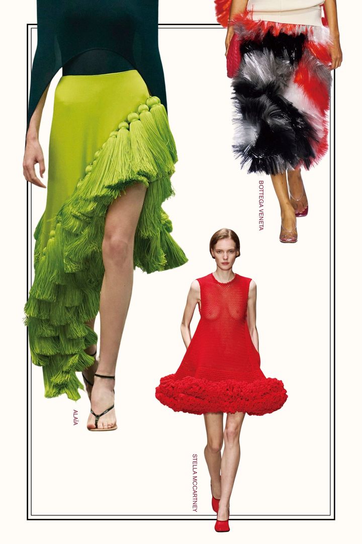 オートクチュールとの垣根を感じさせない、手仕事を凝らしたアイテムの数々がプレタポルテのランウェイにも登場。リュクスな素材で仕立てられた装飾は、目を見張る完成度。