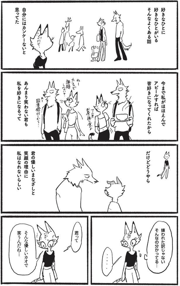 モテる人を好きになってしまった…こんな私じゃ、きっとダメだよね。折れた耳がチャームポイントの雑種犬・ノラは、人気者でモテ男のオオカミ・アルに恋をする。「今日は会えるかな…」寝ても覚めてもアルに夢中のノラ。一方、アルにも気になる人がいて――? 切なさと愛しさが胸にじんわり広がる、甘酸っぱい獣人群像劇『おもいこみのノラ』をお楽しみください!