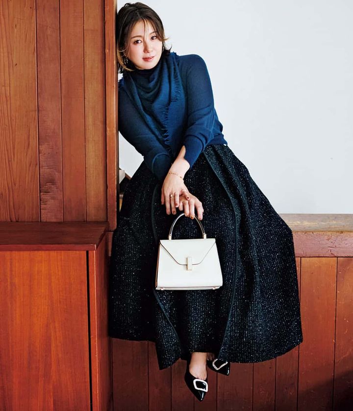 ストール¥14,300(ルナルーチェ/ムーンバット)ニット¥49,500(コズ マニュファクチャード バイ ラッピンノット/ウメダニット)スカート¥68,200(アドーア)バッグ¥594,000(ヴァレクストラ/ヴァレクストラ ジャパン)パンプス¥39,600(ファビオ ルスコーニ/伊勢丹新宿本店 本館2階 婦人靴)ピアス¥193,600ブレスレット¥239,800リング[右手]¥89,100リング[左手中指]¥146,300リング[左手小指]¥88,000(すべてヒロタカ/ヒロタカ 表参道ヒルズ)
