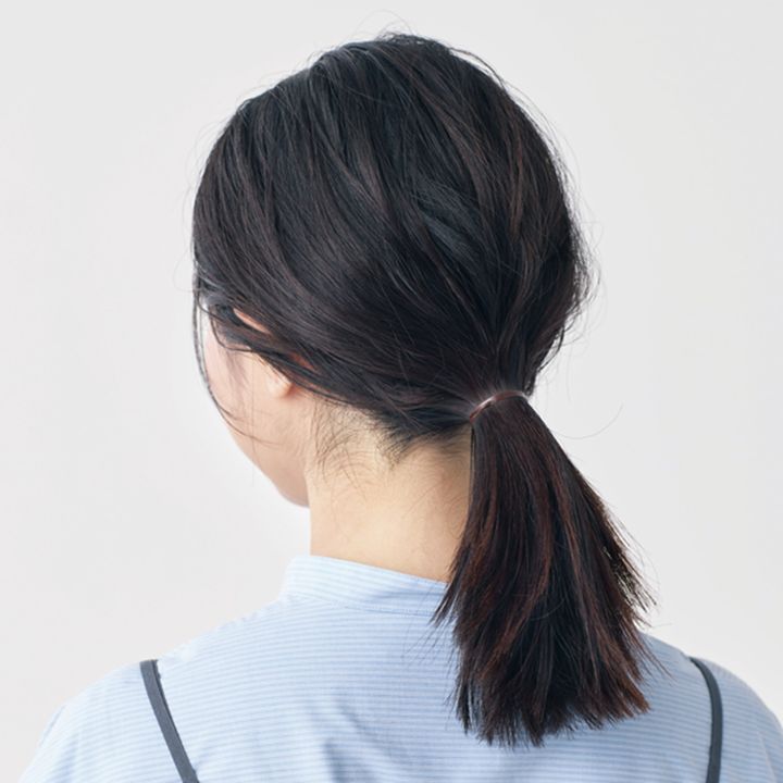 全体がボワッと広がるうねりをカバーするには、オイルをまんべんなくつけてからテンションがかかるようにキュッとひとつにまとめて低めで結ぶのが正解。結んだ根元には幅のあるヘアカフスをつけると、広がりが隠せるだけでなく縦ラインが強調されてスリムな印象に。