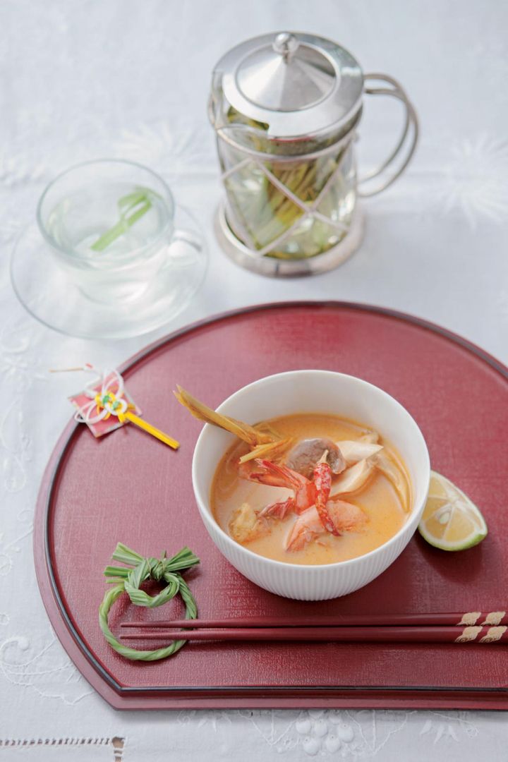 辛味と酸味が絶妙のバランスで混じり合う、タイ料理を代表するスープ。本格的に作るには、コブミカンの葉など数種類のエスニック系のハーブが必要ですが、今回は市販のトムヤムクンのもとを使って手軽に。レモングラスの葉鞘をたたいて加えれば、ぐっと本場の味に近づけます。