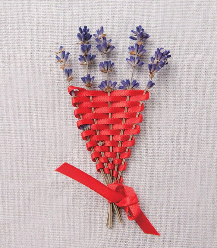 オーナメントのラヴェンダーファン。ラヴェンダー5本を茎の部分でしっかり束ね、穂先に向かってリボンを交互に通しながら編んでいく。枝の間隔を広げながらリボンを通すのがコツ。