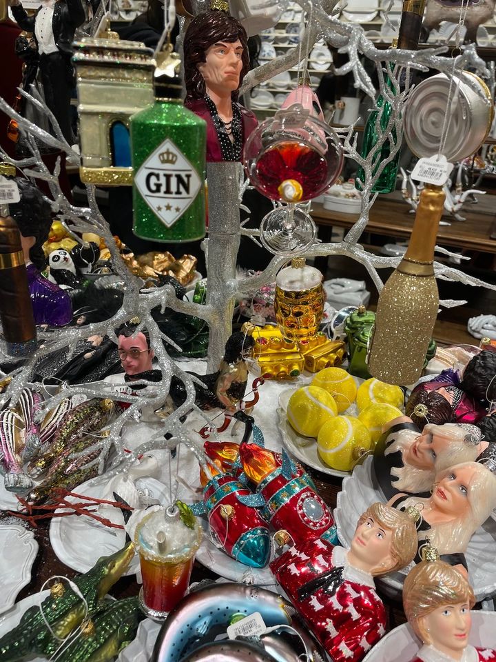 ついついこの時期、手が伸びてしまいそうな楽しげな輝きを放っていた一角に並ぶのは、ちょっとキッチュでポップなオーナメントの数々。ファッションアイコンやセレブといった人物フィギュアから手にずボールにジンボトルまで、遊び心満載のラインナップ。
