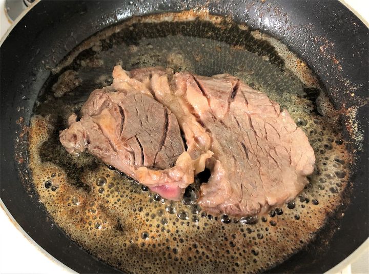 いつもの焼き方だと、牛肉の水分が飛んでしまって、パサパサ、固い食感になりがちです。この焼き方で焼いてみると、肉の水分が残っていてジューシーな食感でした。