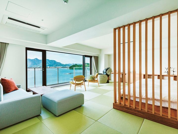 「瀬戸内の穏やかな島時間が流れるなか、地下1700mから湧き出る希少な温泉に体の芯から潤う滞在がかなう宿。太古の海水が1億2千万年の時を経て高濃度ラドン泉に。細胞が刺激され驚くべき保温・保湿効果を実感。ぬる湯の心地よさに入浴時間最長記録を更新!」