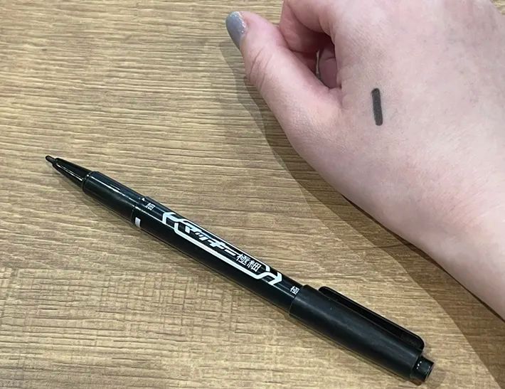 ヘアゴムで油性ペンのついた肌をこすると、きれいに落ちるのだとか。
