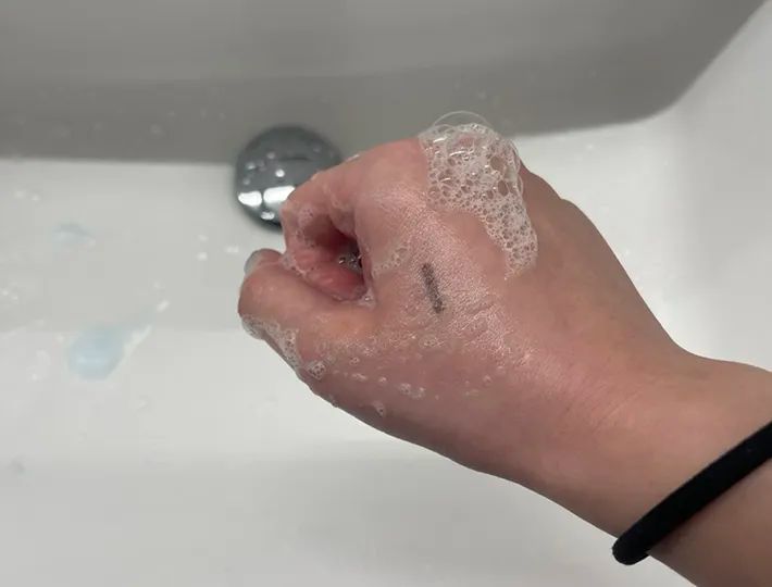 油性ペンのインクがついた手を石鹸で洗う
