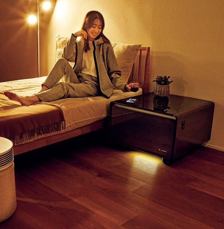 サイドテーブルと見せかけて、高スペックな冷蔵庫でもあるのです。2カ所のワイヤレス充電機能、USBポート、冷蔵庫に加え、アンクルライトを搭載。ワンランク上のスマートな生活を演出してくれる。