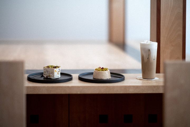 コンセプトは「ブレンド」。なじみのある素材を新たに掛け合わせ、お茶とカクテルの境界を越えるメニューを提案しています。韓国の伝統酒・法酒とダージリン紅茶を組み合わせた一杯や、イタリアのパンナコッタに韓国のどんぐりを合わせたデザート₩8,500 (写真中央)など、意外性に満ちたラインナップがそろいます。なかでもシグネチャーの「ごま油ほうじ茶クリームラテ」₩9,500 (写真右)は、香ばしさとまろやかさが重なり合う印象的な味わい。18時まではブレンドティーやミルクティー、ティーカクテル、デザートを提供し、18時以降はティーカクテル中心の営業に。予約は受け付けておらず当日ウェイティング制ですが、13時〜15時は混み合い、17時〜19時は比較的ゆったりと過ごせます。
