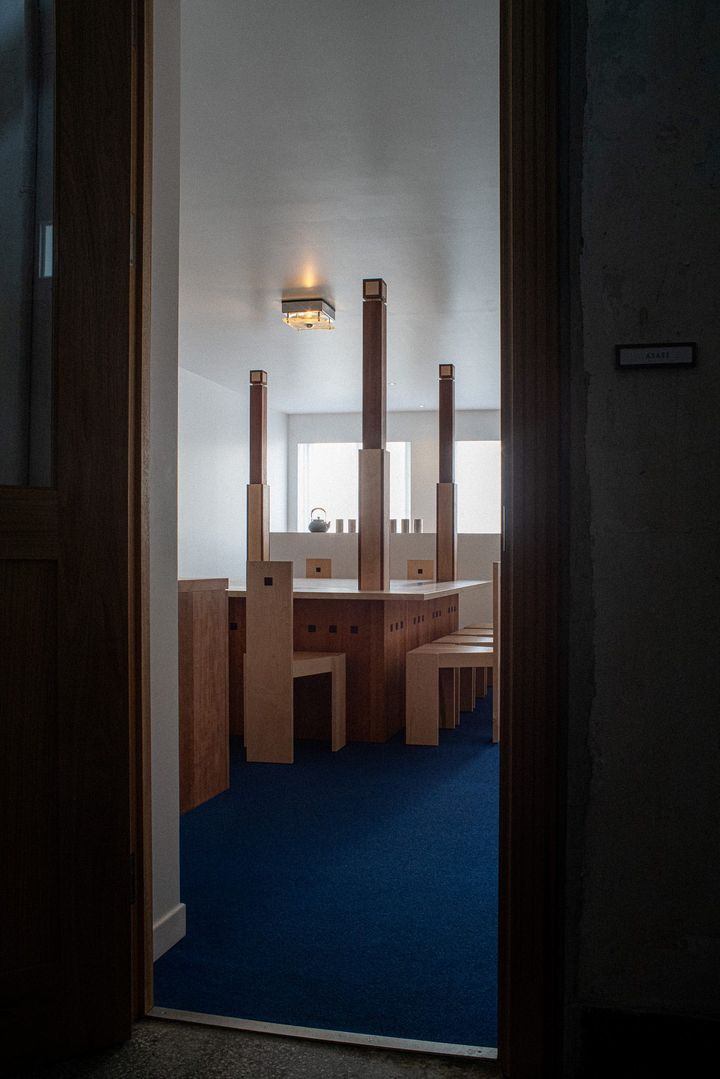 青いカーペットと、1920年代アール・デコに着想を得た直線的で幾何学的な木製インテリアが、静謐で象徴的な雰囲気を生み出しています。店内中央には大きな正方形のテーブルが一つだけ配され、ほどよい距離感のなかでそれぞれが自分の時間に向き合えます。1960〜70年代のヴィンテージ、「タンノイ」のスピーカー“チャットワース”と「マランツ」のアンプから流れる柔らかな音楽も、この空間の大きな魅力。