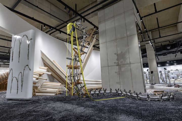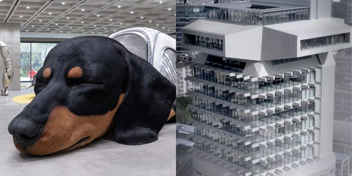 宇宙船のような外観を通り抜けると、「タンバリンズ」の香水“サンシャイン”のアイコンである巨大なダックスフントがお出迎え。2階はロン・ミュエクの作品を思わせる巨大な人型オブジェと宇宙的な構造物が、映画のセットのような雰囲気を演出する「ジェントルモンスター」のフロア。3つのブランドが共存する3階は、銀糸とデニムを組み合わせたツイードの床が印象的なヘッドウェアブランド「アティシュ」、赤いネイルのディテールが目を引くテーブルウェアブランド「ヌフラット」、そして1階とは対照的な小さく愛らしいダックスフントが迎えてくれる「タンバリンズ」が有機的につながっています。5階は独創的なティータイムを楽しめる「ヌデイク ティーハウス」。