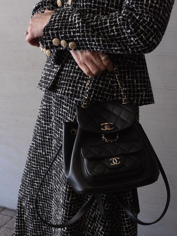 バッグはシャネルのバックパックを合わせて、ほどよくモダンなムードに。足元はベロア素材のローファーで、全体をやさしく引き締めました。