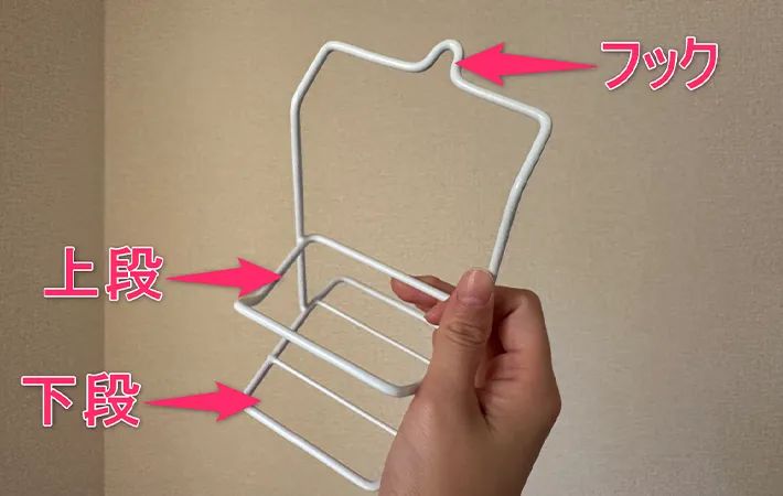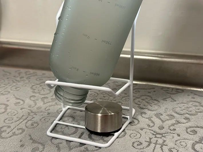 上段でボトル本体、下段で蓋、背面のフック部分でリング上のパッキンを引っ掛けて乾かすことができます。