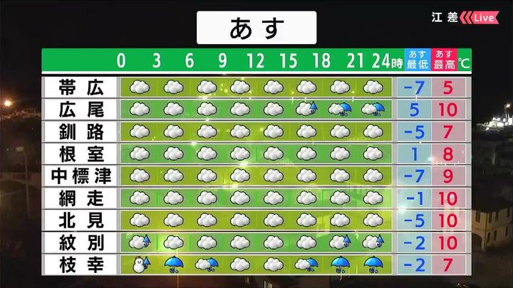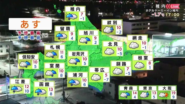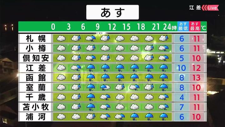 札幌や倶知安、千歳は朝晩を中心に雨、函館や浦河は一日を通して雨が降るでしょう。雪の多い傾斜地でのなだれや河川の増水などに注意して下さい。