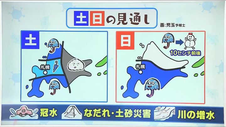 あす20日(土)は西側の地域で雨が降り、道北や道南で雨が強まるでしょう。日曜は各地で雨が強まります。午後は道北やオホーツク海側で雪に変わり、10センチくらい降りそうです。道路の冠水や傾斜地でのなだれ、土砂災害、河川の増水などに注意して下さい。
