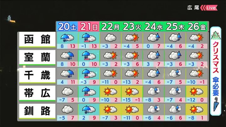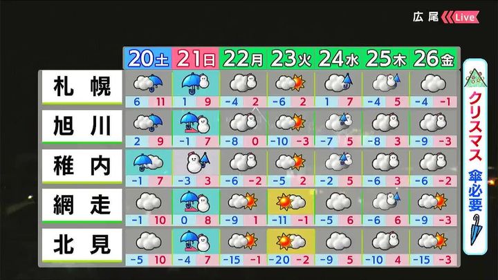 日曜の午後は急速に気温が下がり、道北やオホーツク海側で10センチくらいの雪が降りそうです。水曜は気温が上がり、イブは雨やミゾレが降るでしょう。