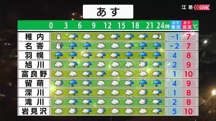 朝晩を中心に雨で、名寄や羽幌周辺は降り方が強まるでしょう。最高気温は10度くらいです。路面はツルツル、ザクザク、グチャグチャと変わりやすいでしょう。