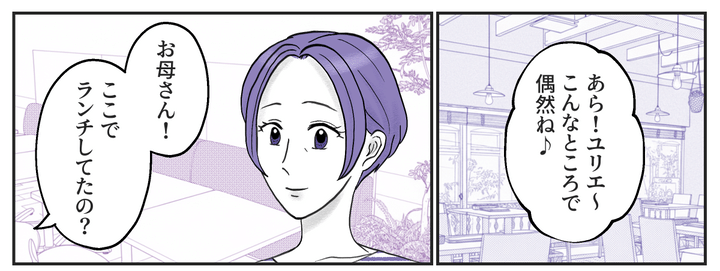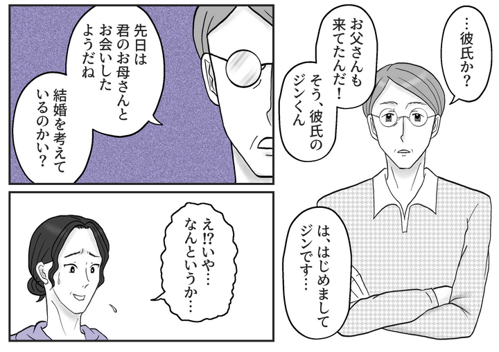 私はユリエ(23歳)。彼氏のジン(27歳)とは合コンで知り合い、付き合って3ヶ月です。先日のデート中、ジンのママにたまたま会いました。けれどお母さんや友だちに言わせれば、会ったのは偶然なんかじゃないそうです。ジンのママはジンと示し合わせて、私のことを見定めに来たのです。だから私も同じことをして、自分の親にジンを判断してもらおうと決めました。そしてデート当日。うちの両親は、私とジンの後方の席で話を聞いていてくれたようで……?