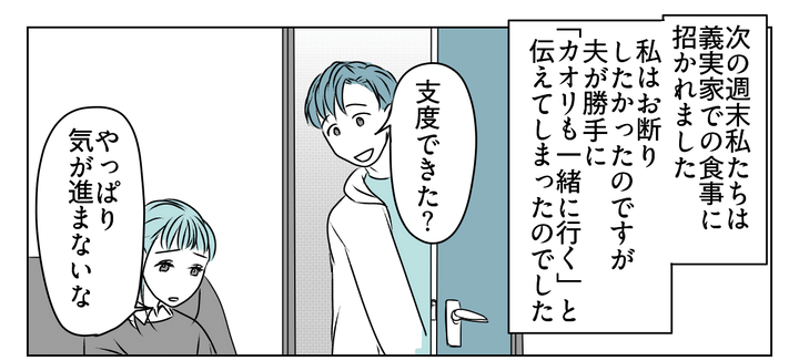 次の週末、義実家での食事に招かれました。気が進まないのですが、夫が勝手に私も行くと伝えてしまい……。波風を立てたくない私は、渋々ながら向かうことにしました。