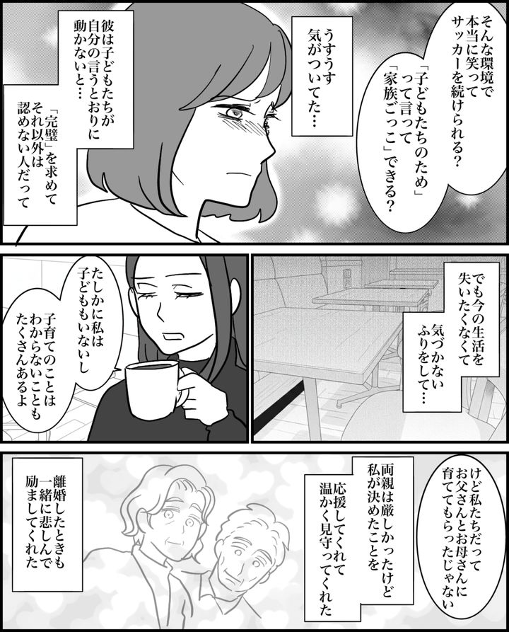 私(トモコ)は長女のアオイ(中2)と次女のユウナ(小4)を連れ、3年前にリョウタと再婚しました。子どもたちのサッカーをずっと熱心にサポートしてくれていたリョウタ。しかし子どもたちがサッカーへの熱意を失うと、自分自身を否定されたように感じたのでしょう。リョウタは離婚しない代わりに、もう何の期待もしない。私たちの関係を「家族」から「家族ごっこ」に切り替えよう、と言い出しました。しかし妹のミサは、私の間違いを指摘します。