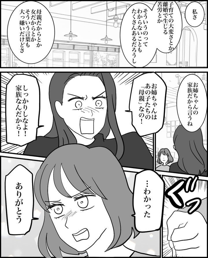 私は母親として子どもたちを「受け入れる」べき存在です。けれど今のこの家族は、子どもたちに「受け入れてもらって」成立しているように思えます。自分のあやまちに気付いた瞬間、涙が頬を伝いました。ミサはそんな私を励まします。
