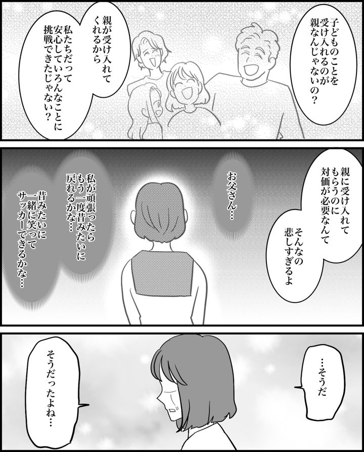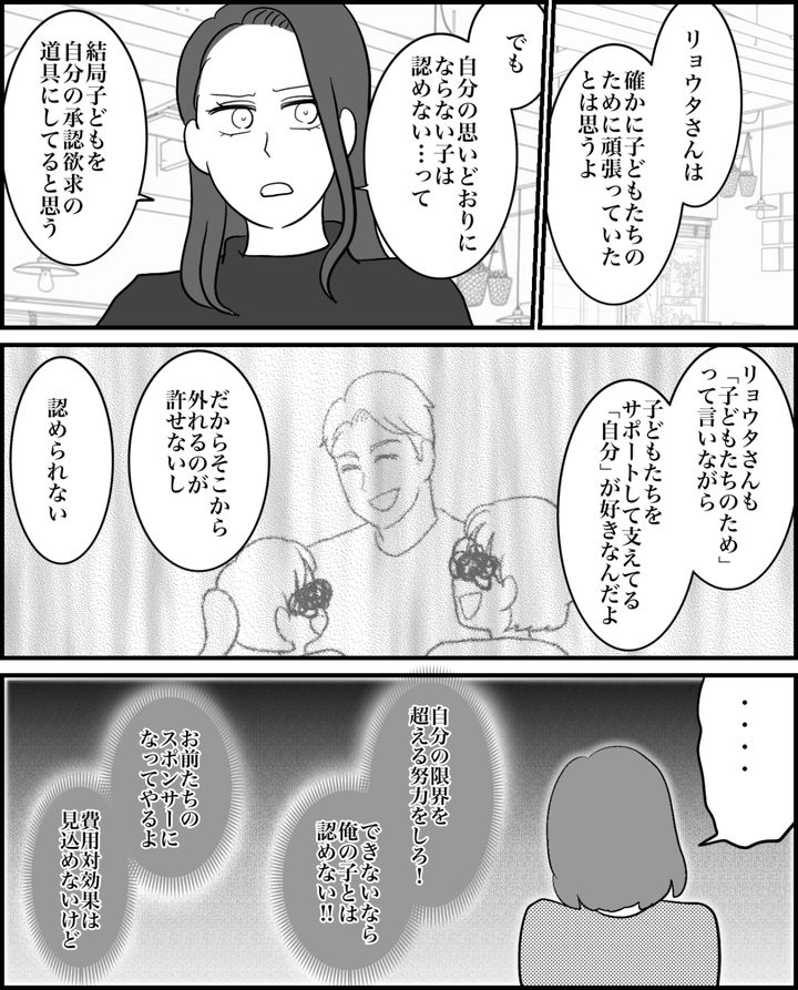 リョウタは子どもたちを自分の承認欲求を満たすために使っていたのです。それも愛情のひとつなのかもしれないけれど、子どもを受け入れる親の愛情とは違うでしょう。私はリョウタと子どもたちともう一度しっかり話し合って、今後のことを決めなくてはと思ったのでした。