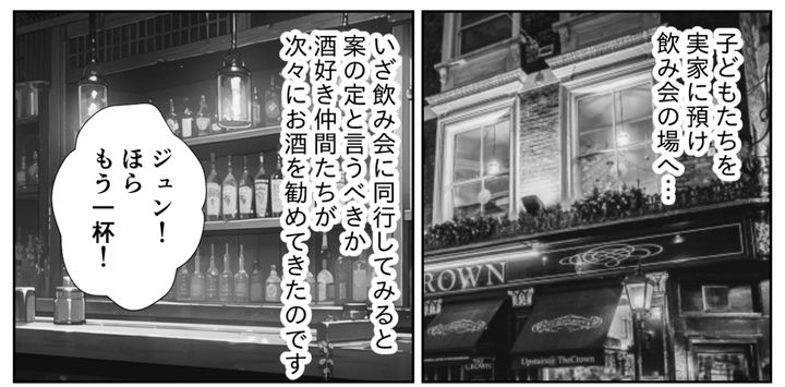 しかし仲間たちにお酒を勧められるまま飲み出した夫を見て、参加させたのは失敗だったと後悔しています。