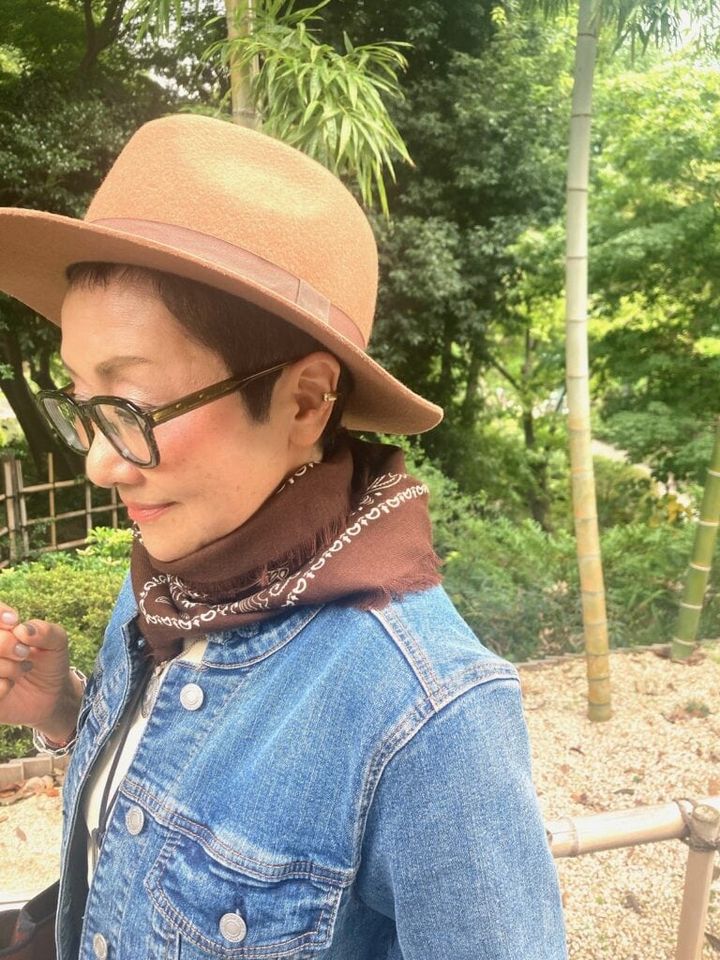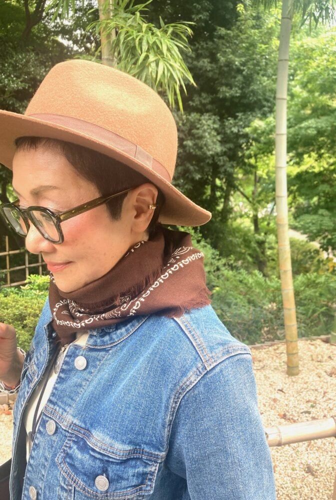 「帽子は好きで毎日かぶっています。このウールハット、高そうに見えて実は 『しまむら』で購入したもの。お値段以上で質もなかなか良くて愛用中。好きなものが決まっているのでプチプラでも似合うものを見つけるのは腕の見せどころ。ファッションを楽しむ醍醐味ですね。また、私は身長が150cm以下と小柄なのでストールやスカーフを巻くと、重心も視線も上がり小顔に見えるので昔からよく取り入れています。ヘアスタイルもベリーショートなのですっきりと巻きやすいです」