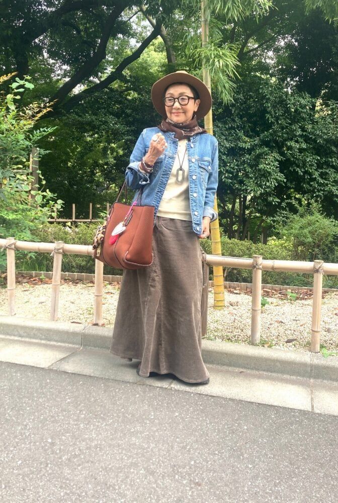 この日は素敵なあの人のイベントに参加していた加藤さん。「秋なので、デニムジャケットにコーデュロイのマキシ丈スカートを合わせました。150cmない私には、とにかくバランスを取りやすいのが、マキシ丈スカート。自分らしくてお気に入りの定番アイテムなんです。デニムジャケットは腕まくりでスタイリッシュに。今日のコーデの主役は今季のトレンドカラーブラウンのバンダナ柄ウールスカーフ。秋口になりようやく初おろし出来ました。インナーは淡い色味の薄手のニットでシンプルにしてスカーフを際立たました。足元は『GU』のボリュームソールブーツ。こちらもスカーフに合わせてブラウンに」