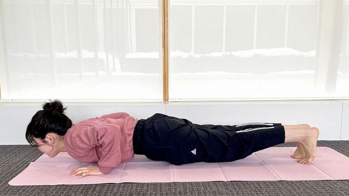 鼻から息を吸って、体を前にスライド。足の甲を床につけ、ひじを伸ばす。