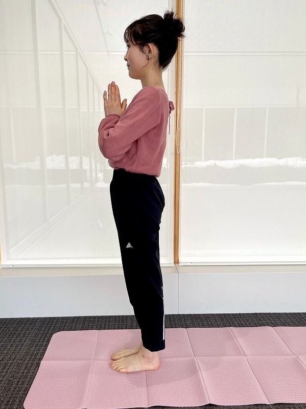 まっすぐ背骨を伸ばして立ち、胸の前で手のひらを合わせる。