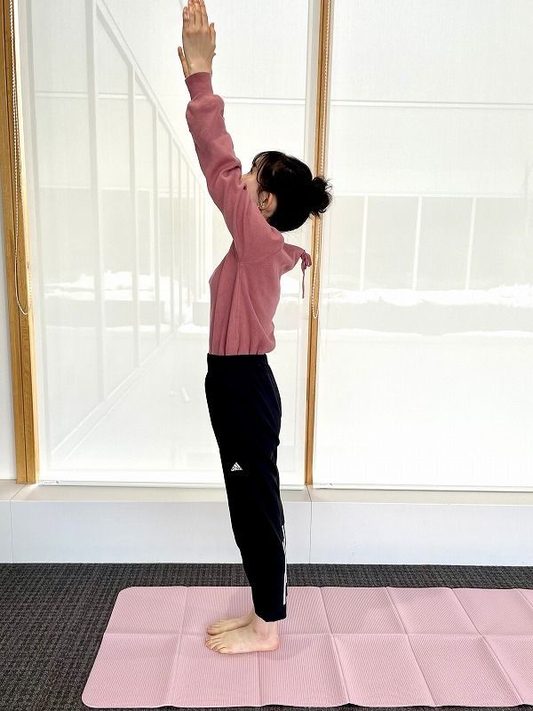 鼻から息を吸って、両手を天井に向かって上げながら、ゆっくり立ちあがる。