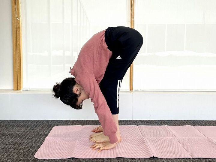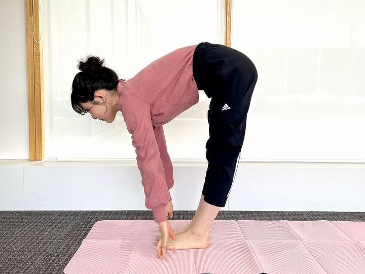 鼻から息を吐きながら、手のひらを床につけて深い前屈。