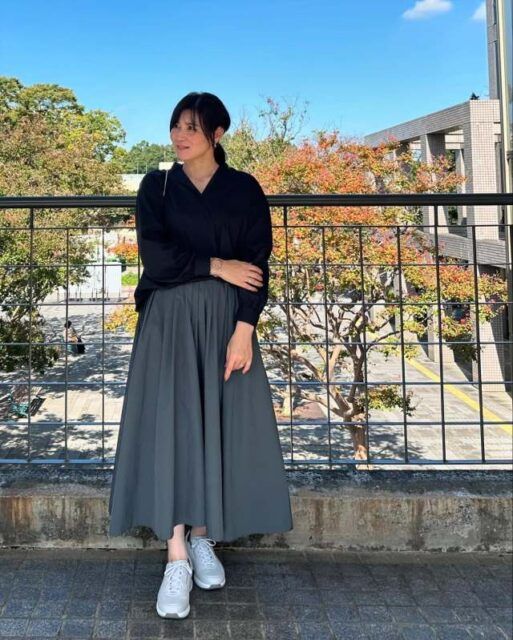 スニーカーを女性らしく履きたいときは「ロング丈のフレアスカート」を合わせましょう。ふわりと広がるスカートは体型カバーしながらエレガントな印象を与えます。